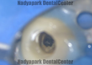 マイクロスコープでしっかりと「見て確認をしながら」根管内の汚れ等を除去。